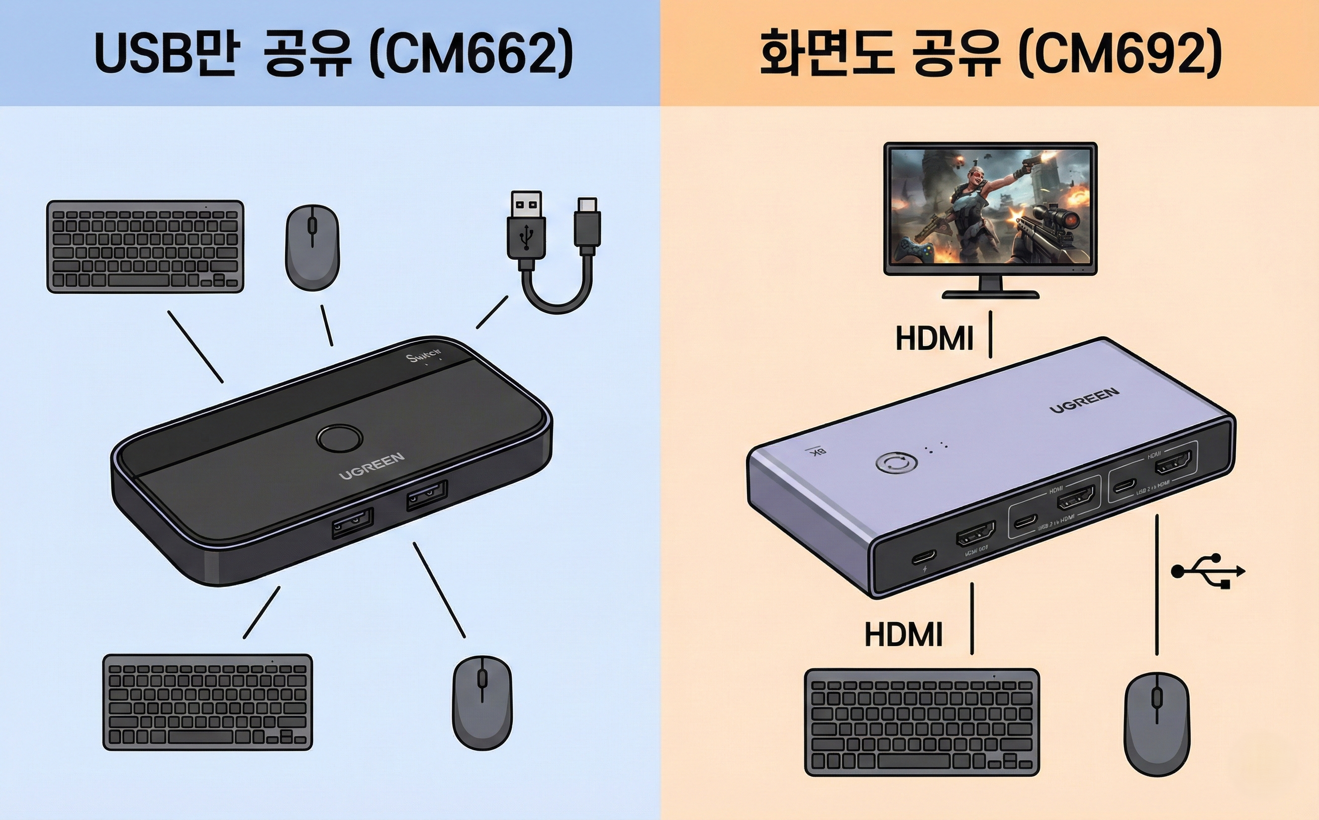 | 비교 항목 | CM662 (USB 스위치) | CM692 (KVM 스위치) |