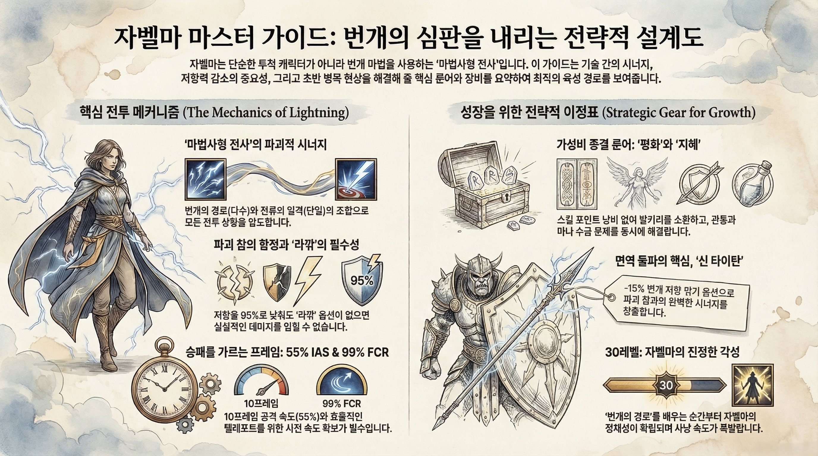 오늘은 최종적으로 스킬 포인트를 어디에 몇 개 찍어야 하는지, 최종 스탯은 숫자를 몇으로 맞춰야 하는지, 그리고 2.5 패치 이후 자벨마의 필수품이 된 '파괴 참'을 어떻게 활용해야 진짜 화력이 나오는지 아주 상세하게 풀어드리겠습니다. 초보자분들도 이 글 하나만 순서대로 따라오시면 절대 막히는 일 없이 졸업까지 직행하실 수 있습니다.