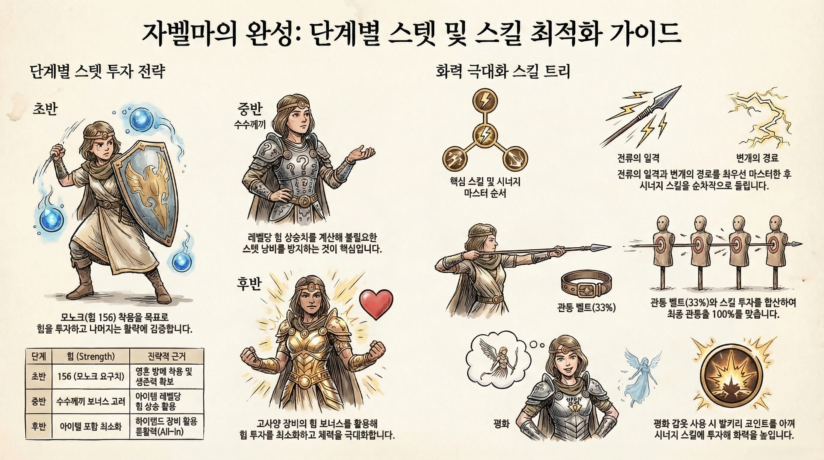 자벨마의 스탯 투자는 나중에 착용할 최종 장비인 수수께끼(Enigma)와 모너크 방패를 미리 계산해서 낭비를 1포인트도 남기지 않는 것이 핵심입니다. 초반에 마나가 부족하다고 에너지(마력)에 포인트를 투자하시면 절대 안 됩니다. 마나는 장비와 용병으로 해결합니다.