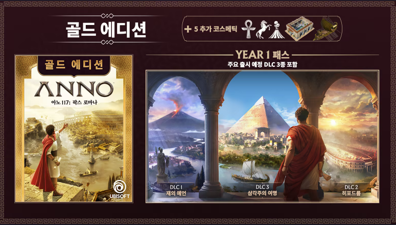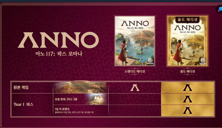 - Year 1 패스 세부 스펙: 새로운 속주와 시스템을 확장하는 대형 DLC 3종 + 1일 차 콘텐츠 보너스 (플레이어 시길 3개, 선박 스킨 1개, 전용 장식품 1개).